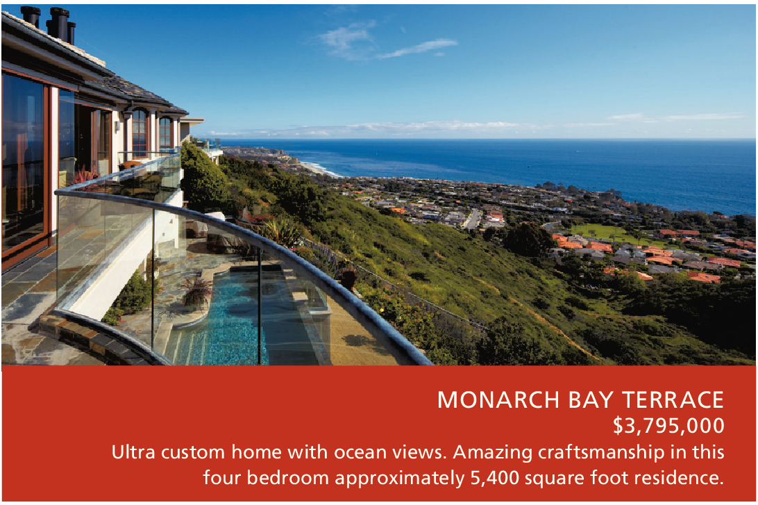MONARCH BAY TERRACE $3,795,000 Ultra custom home with ocean views. Amazing craftsmanship in this four bedroom approximately 5,400 square foot residence.