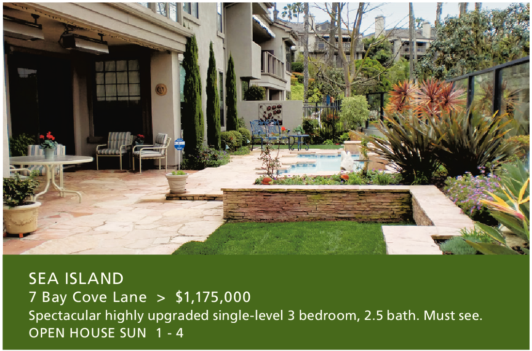SEA ISLAND 7 Bay Cove Lane > $1,175,000 Spectacular highly upgraded single-level 3 bedroom, 2.5 bath. Must see. OPEN HOUSE SUN 1 - 4