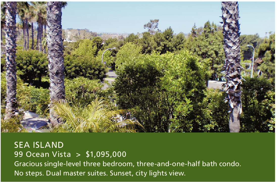 SEA ISLAND 99 Ocean Vista > $1,095,000 Gracious single-level three bedroom, three-and-one-half bath condo. No steps. Dual master suites. Sunset, city lights view.