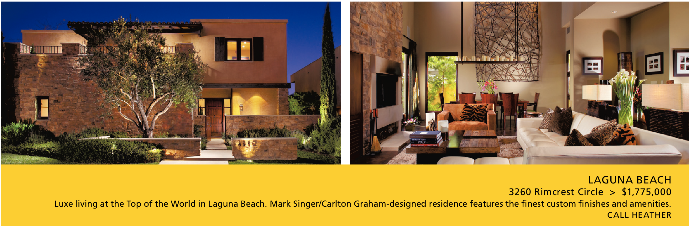LAGUNA BEACH 3260 Rimcrest Circle > $1,775,000 Luxe living at the Top of the World in Laguna Beach. Mark Singer/Carlton Graham-designed residence features the finest custom finishes and amenities.