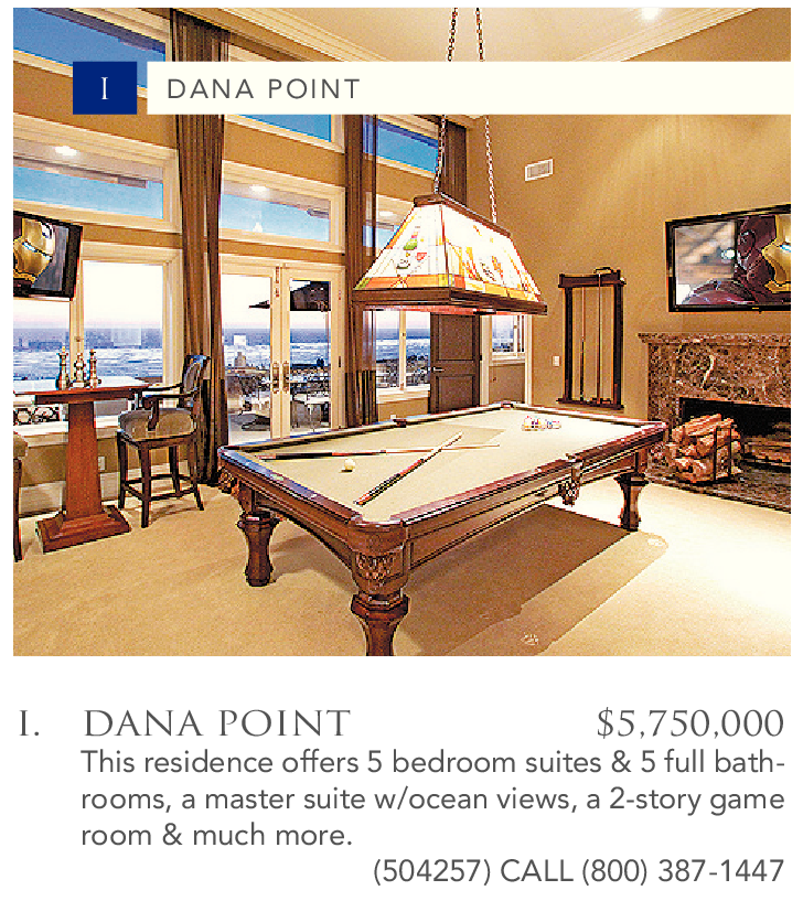 DANA POINT $5,750,000 This residence offers 5 bedroom suites & 5 full bathrooms, a master suite w/ocean views, a 2-story game room & much more.