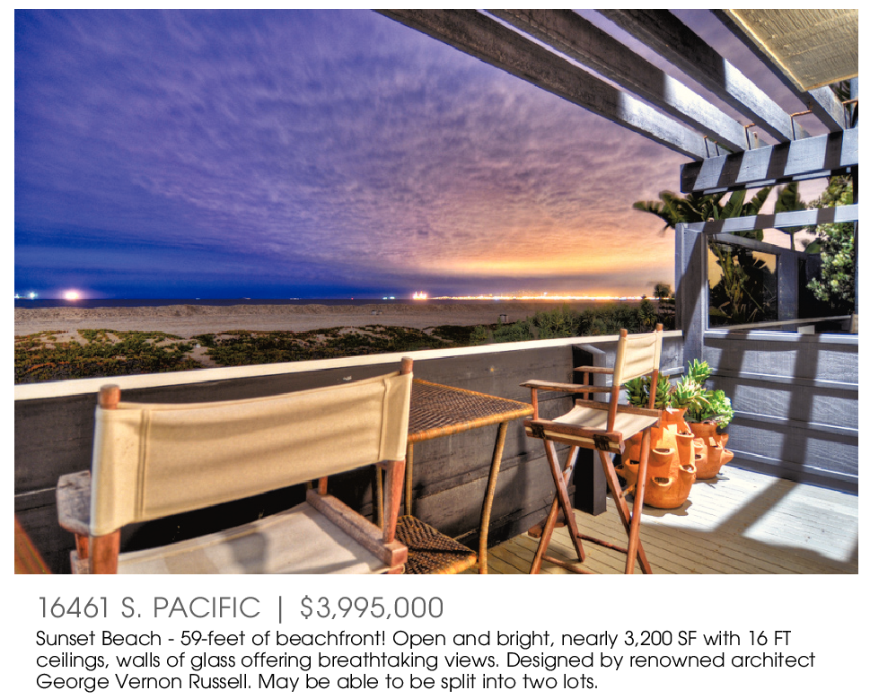 16461 S. PACIFIC | $3,995,000 Sunset Beach - 59-feet of beachfront! Open and bright, nearly 3,200 SF with 16 FT ceilings, walls of glass offering breathtaking views. Designed by renowned architect George Vernon Russell. May be able to be split into two lots.