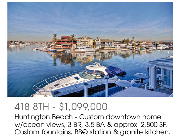 418 8TH - $1,099,000 Huntington Beach - Custom downtown home w/ocean views, 3 BR, 3.5 BA & approx. 2,800 SF. Custom fountains, BBQ station & granite kitchen.