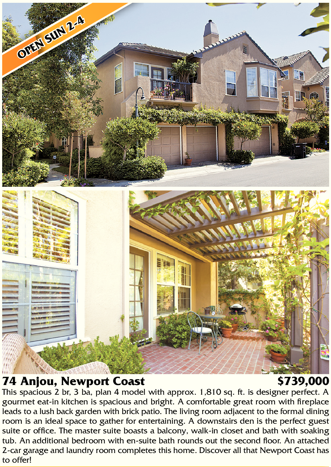 74 Anjou, Newport Coast $739,000 This spacious 2 br, 3 ba, plan 4 model with approx. 1,810 sq. ft. is designer perfect. A gourmet eat-in kitchen is spacious and bright. A comfortable great room with fireplace leads to a lush back garden with brick patio. The living room adjacent to the formal dining room is an ideal space to gather for entertaining. A downstairs den is the perfect guest suite or office. The master suite boasts a balcony, walk-in closet and bath with soaking tub. An additional bedroom with en-suite bath rounds out the second floor. An attached 2-car garage and laundry room completes this home. Discover all that Newport Coast has to offer!