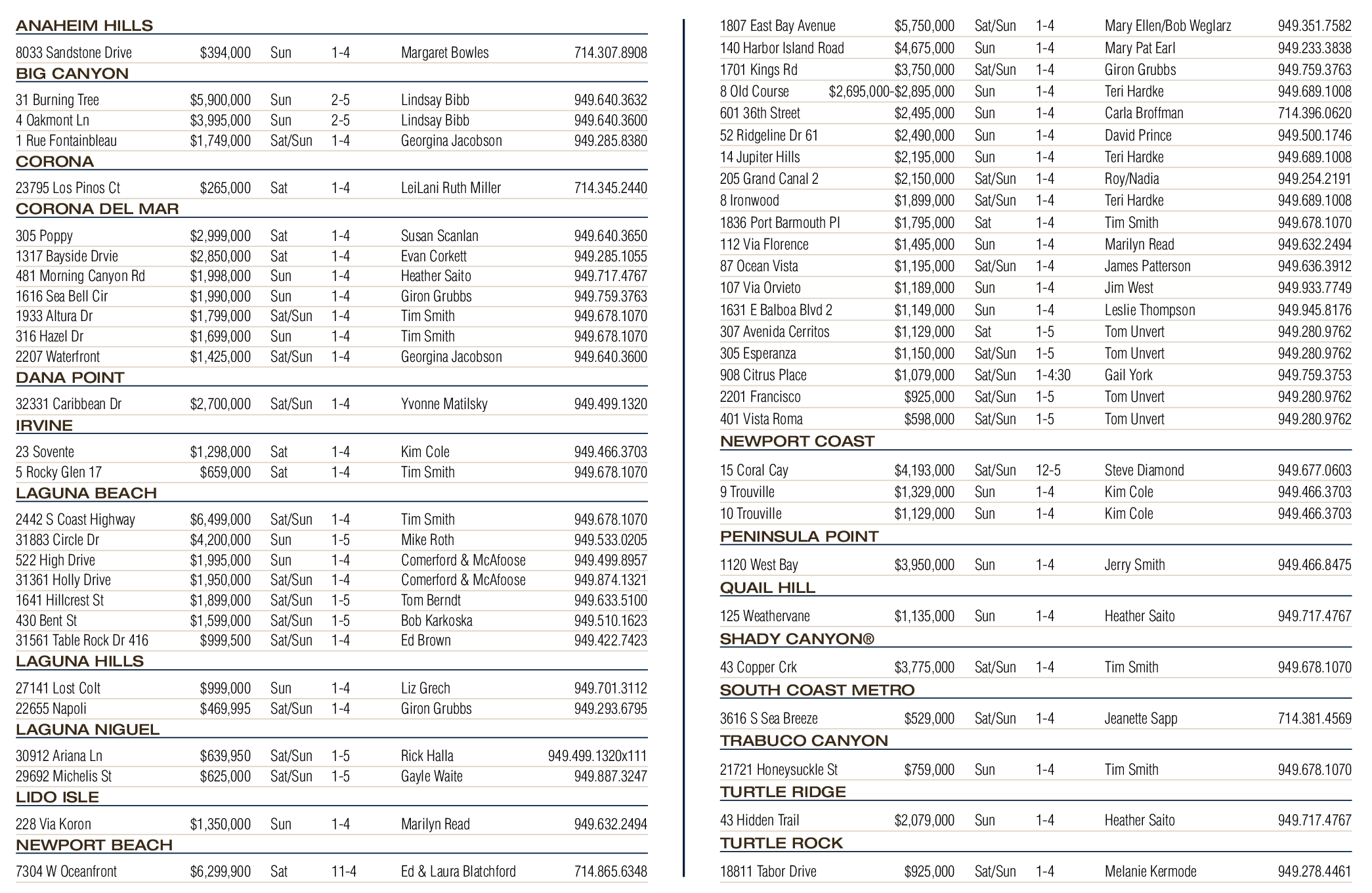 ANAHEIM HILLS 8033 Sandstone Drive $394,000 Sun 1-4 Margaret Bowles 714.307.8908 BIG CANYON 31 Burning Tree $5,900,000 Sun 2-5 Lindsay Bibb 949.640.3632 4 Oakmont Ln $3,995,000 Sun 2-5 Lindsay Bibb 949.640.3600 1 Rue Fontainbleau $1,749,000 Sat/Sun 1-4 Georgina Jacobson 949.285.8380 CORONA 23795 Los Pinos Ct $265,000 Sat 1-4 LeiLani Ruth Miller 714.345.2440 CORONA DEL MAR 305 Poppy $2,999,000 Sat 1-4 Susan Scanlan 949.640.3650 1317 Bayside Drvie $2,850,000 Sat 1-4 Evan Corkett 949.285.1055 481 Morning Canyon Rd $1,998,000 Sun 1-4 Heather Saito 949.717.4767 1616 Sea Bell Cir $1,990,000 Sun 1-4 Giron Grubbs 949.759.3763 1933 Altura Dr $1,799,000 Sat/Sun 1-4 Tim Smith 949.678.1070 316 Hazel Dr $1,699,000 Sun 1-4 Tim Smith 949.678.1070 2207 Waterfront $1,425,000 Sat/Sun 1-4 Georgina Jacobson 949.640.3600 DANA POINT 32331 Caribbean Dr $2,700,000 Sat/Sun 1-4 Yvonne Matilsky 949.499.1320 IRVINE 23 Sovente $1,298,000 Sat 1-4 Kim Cole 949.466.3703 5 Rocky Glen 17 $659,000 Sat 1-4 Tim Smith 949.678.1070 LAGUNA BEACH 2442 S Coast Highway $6,499,000 Sat/Sun 1-4 Tim Smith 949.678.1070 31883 Circle Dr $4,200,000 Sun 1-5 Mike Roth 949.533.0205 522 High Drive $1,995,000 Sun 1-4 Comerford & McAfoose 949.499.8957 31361 Holly Drive $1,950,000 Sat/Sun 1-4 Comerford & McAfoose 949.874.1321 1641 Hillcrest St $1,899,000 Sat/Sun 1-5 Tom Berndt 949.633.5100 430 Bent St $1,599,000 Sat/Sun 1-5 Bob Karkoska 949.510.1623 31561 Table Rock Dr 416 $999,500 Sat/Sun 1-4 Ed Brown 949.422.7423 LAGUNA HILLS 27141 Lost Colt $999,000 Sun 1-4 Liz Grech 949.701.3112 22655 Napoli $469,995 Sat/Sun 1-4 Giron Grubbs 949.293.6795 LAGUNA NIGUEL 30912 Ariana Ln $639,950 Sat/Sun 1-5 Rick Halla 949.499.1320x111 29692 Michelis St $625,000 Sat/Sun 1-5 Gayle Waite 949.887.3247 LIDO ISLE 228 Via Koron $1,350,000 Sun 1-4 Marilyn Read 949.632.2494 NEWPORT BEACH 7304 W Oceanfront $6,299,900 Sat 11-4 Ed & Laura Blatchford 714.865.6348