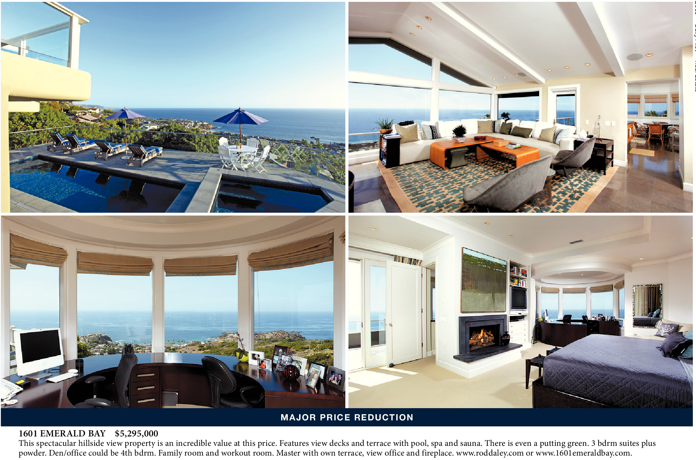 1601 EMERALD BAY $5,295,000 This spectacular hillside view property is an incredible value at this price. Features view decks and terrace with pool, spa and sauna. There is even a putting green. 3 bdrm suites plus powder. Den/office could be 4th bdrm. Family room and workout room. Master with own terrace, view office and fireplace. www.roddaley.com or www.1601emeraldbay.com. MAJOR PRICE REDUCTION