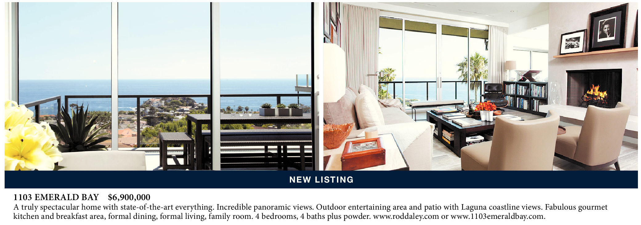 1103 EMERALD BAY $6,900,000 A truly spectacular home with state-of-the-art everything. Incredible panoramic views. Outdoor entertaining area and patio with Laguna coastline views. Fabulous gourmet kitchen and breakfast area, formal dining, formal living, family room. 4 bedrooms, 4 baths plus powder. www.roddaley.com or www.1103emeraldbay.com.