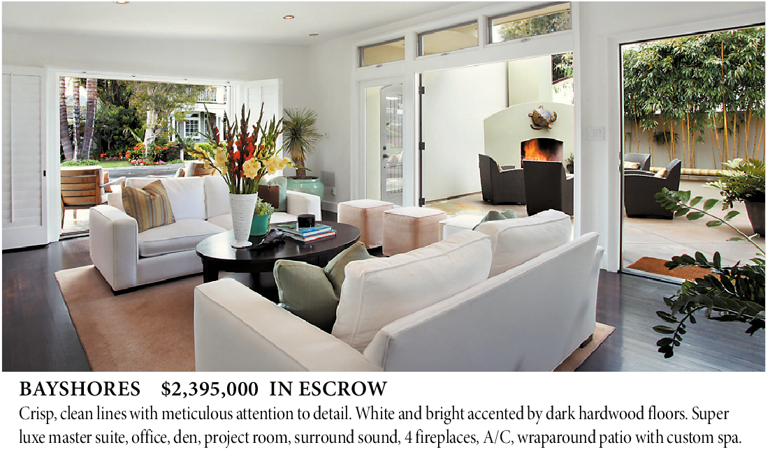 BAYSHORES $2,395,000 IN ESCROW Crisp, clean lines with meticulous attention to detail. White and bright accented by dark hardwood floors. Super luxe master suite, office, den, project room, surround sound, 4 fireplaces, A/C, wraparound patio with custom spa.