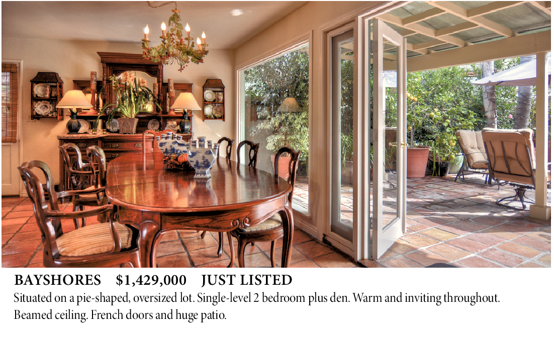 BAYSHORES $1,429,000 JUST LISTED Situated on a pie-shaped, oversized lot. Single-level 2 bedroom plus den. Warm and inviting throughout. Beamed ceiling. French doors and huge patio.