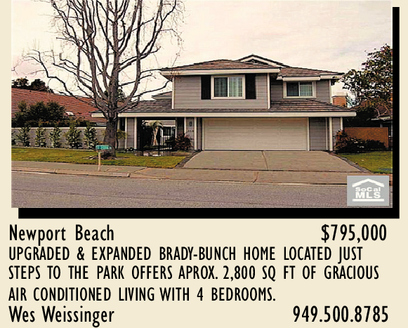 Newport Beach $795,000 UPGRADED & EXPANDED BRADY-BUNCH HOME LOCATED JUST STEPS TO THE PARK OFFERS APROX. 2,800 SQ FT OF GRACIOUS AIR CONDITIONED LIVING WITH 4 BEDROOMS. Wes Weissinger 949.500.8785