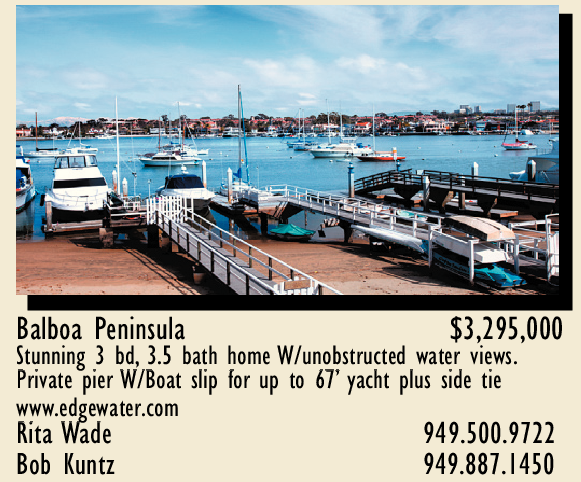 Balboa Peninsula $3,295,000 Stunning 3 bd, 3.5 bath home W/unobstructed water views. Private pier W/Boat slip for up to 67’ yacht plus side tie www.edgewater.com Rita Wade 949.500.9722 Bob Kuntz 949.887.1450