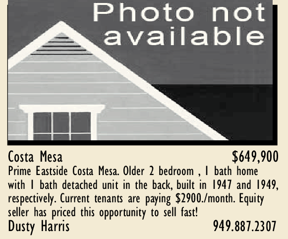 Costa Mesa $649,900 Prime Eastside Costa Mesa. Older 2 bedroom , 1 bath home with 1 bath detached unit in the back, built in 1947 and 1949, respectively. Current tenants are paying $2900./month. Equity seller has priced this opportunity to sell fast! Dusty Harris 949.887.2307