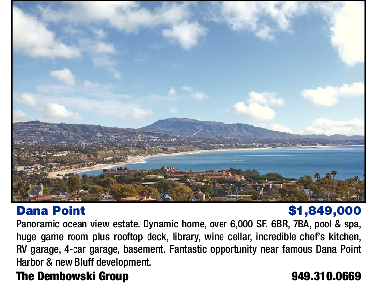Dana Point $1,849,000 Panoramic ocean view estate. Dynamic home, over 6,000 SF. 6BR, 7BA, pool & spa, huge game room plus rooftop deck, library, wine cellar, incredible chef’s kitchen, RV garage, 4-car garage, basement. Fantastic opportunity near famous Dana Point Harbor & new Bluff development. The Dembowski Group 949.310.0669