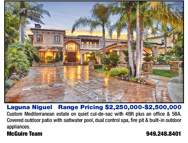 Laguna Niguel Range Pricing $2,250,000-$2,500,000 Custom Mediterranean estate on quiet cul-de-sac with 4BR plus an office & 5BA. Covered outdoor patio with saltwater pool, dual control spa, fire pit & built-in outdoor appliances. McGuire Team 949.248.8401