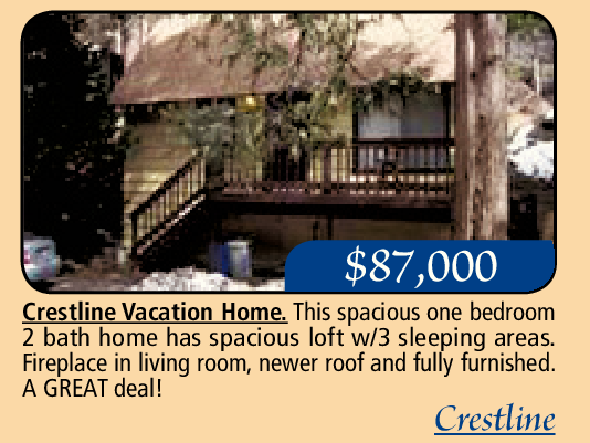 Crestline Vacation Home. This spacious one bedroom 2 bath home has spacious loft w/3 sleeping areas. Fireplace in living room, newer roof and fully furnished. A GREAT deal!