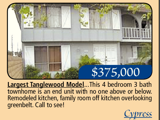 Largest Tanglewood Model...This 4 bedroom 3 bath townhome is an end unit with no one above or below. Remodeled kitchen, family room off kitchen overlooking greenbelt. Call to see!