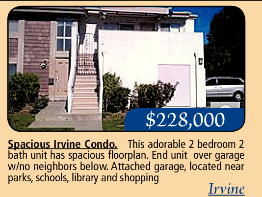 Spacious Irvine Condo. This adorable 2 bedroom 2 bath unit has spacious floorplan. End unit over garage w/no neighbors below. Attached garage, located near parks, schools, library and shopping Irvine