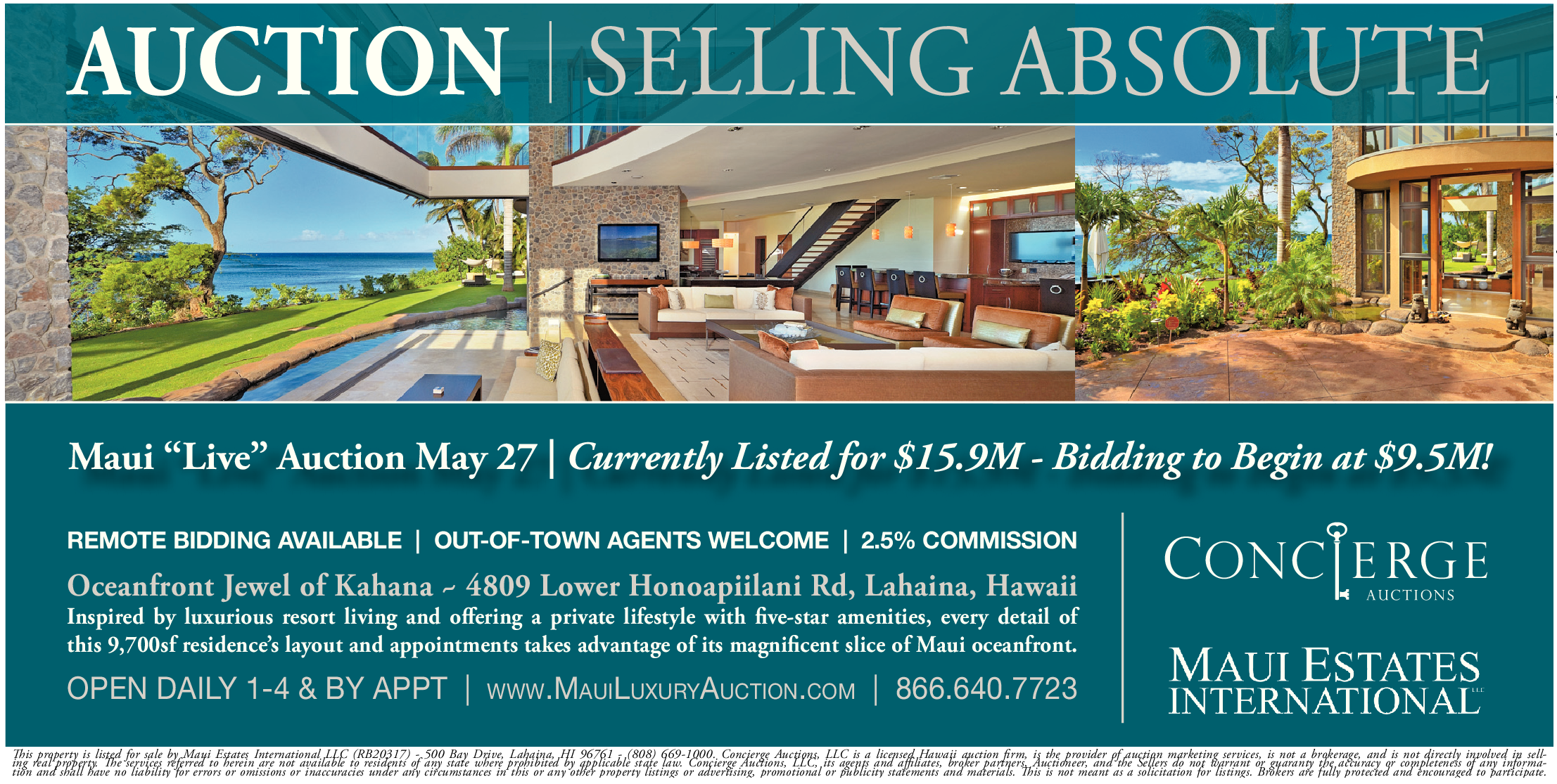 AUCTION SELLING ABSOLUTE Maui “Live” Auction May 27 | Currently Listed for $15.9M - Bidding to Begin at $9.5M! REMOTE BIDDING AVAILABLE | OUT-OF-TOWN AGENTS WELCOME | 2.5% COMMISSION Oceanfront Jewel of Kahana ~ 4809 Lower Honoapiilani Rd, Lahaina, Hawaii Inspired by luxurious resort living and offering a private lifestyle with five-star amenities, every detail of this 9,700sf residence’s layout and appointments takes advantage of its magnificent slice of Maui oceanfront. OPEN DAILY 1-4 & BY APPT | WWW.MAUILUXURYAUCTION.COM | 866.640.7723 This property is listed for sale by Maui Estates International LLC (RB20317) - 500 Bay Drive, Lahaina, HI 96761 - (808) 669-1000. Concierge Auctions, LLC is a licensed Hawaii auction firm, is the provider of auction marketing services, is not a brokerage, and is not directly involved in selling real property. The services referred to herein are not available to residents of any state where prohibited by applicable state law. Concierge Auctions, LLC, its agents and affiliates, broker partners, Auctioneer, and the Sellers do not warrant or guaranty the accuracy or completeness of any information and shall have no liability for errors or omissions or inaccuracies under any circumstances in this or any other property listings or advertising, promotional or publicity statements and materials. This is not meant as a solicitation for listings. Brokers are fully protected and encouraged to participate.