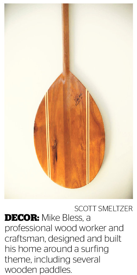However, the home’s centerpiece is the door. The multiwood creation features a surfboard — the inspiration to much of the WoodyBoard pieces — and is surrounded by tempered glass, more colorful wood and a steel “fin” knob. The door serves both as a portal to Bless’ love of woodworking as much as a portal to his new home.