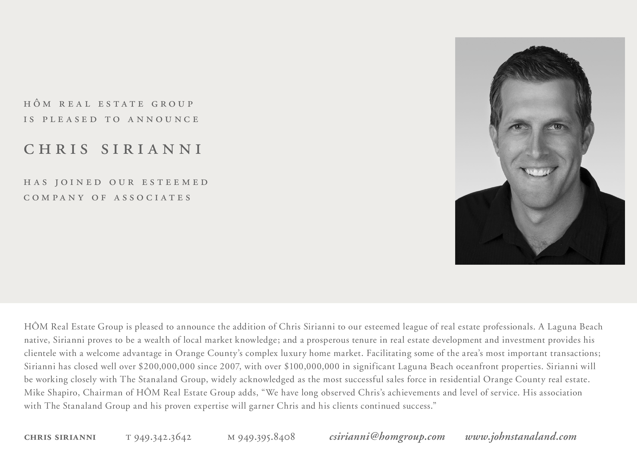 h ô m r e a l e s t a t e g r o u p i s p l e a s e d t o a n n o u n c e c h r i s s i r i a n n i h a s j o i n e d o u r e s t e e m e d c o m pa n y o f a s s o c i a t e s HÔM Real Estate Group is pleased to announce the addition of Chris Sirianni to our esteemed league of real estate professionals. A Laguna Beach native, Sirianni proves to be a wealth of local market knowledge; and a prosperous tenure in real estate development and investment provides his clientele with a welcome advantage in Orange County’s complex luxury home market. Facilitating some of the area’s most important transactions; Sirianni has closed well over $200,000,000 since 2007, with over $100,000,000 in significant Laguna Beach oceanfront properties. Sirianni will be working closely with The Stanaland Group, widely acknowledged as the most successful sales force in residential Orange County real estate. Mike Shapiro, Chairman of HÔM Real Estate Group adds, “We have long observed Chris’s achievements and level of service. His association with The Stanaland Group and his proven expertise will garner Chris and his clients continued success.” chris sirianni t 949.342.3642 m 949.395.8408 csirianni@homgroup.com www.johnstanaland.com