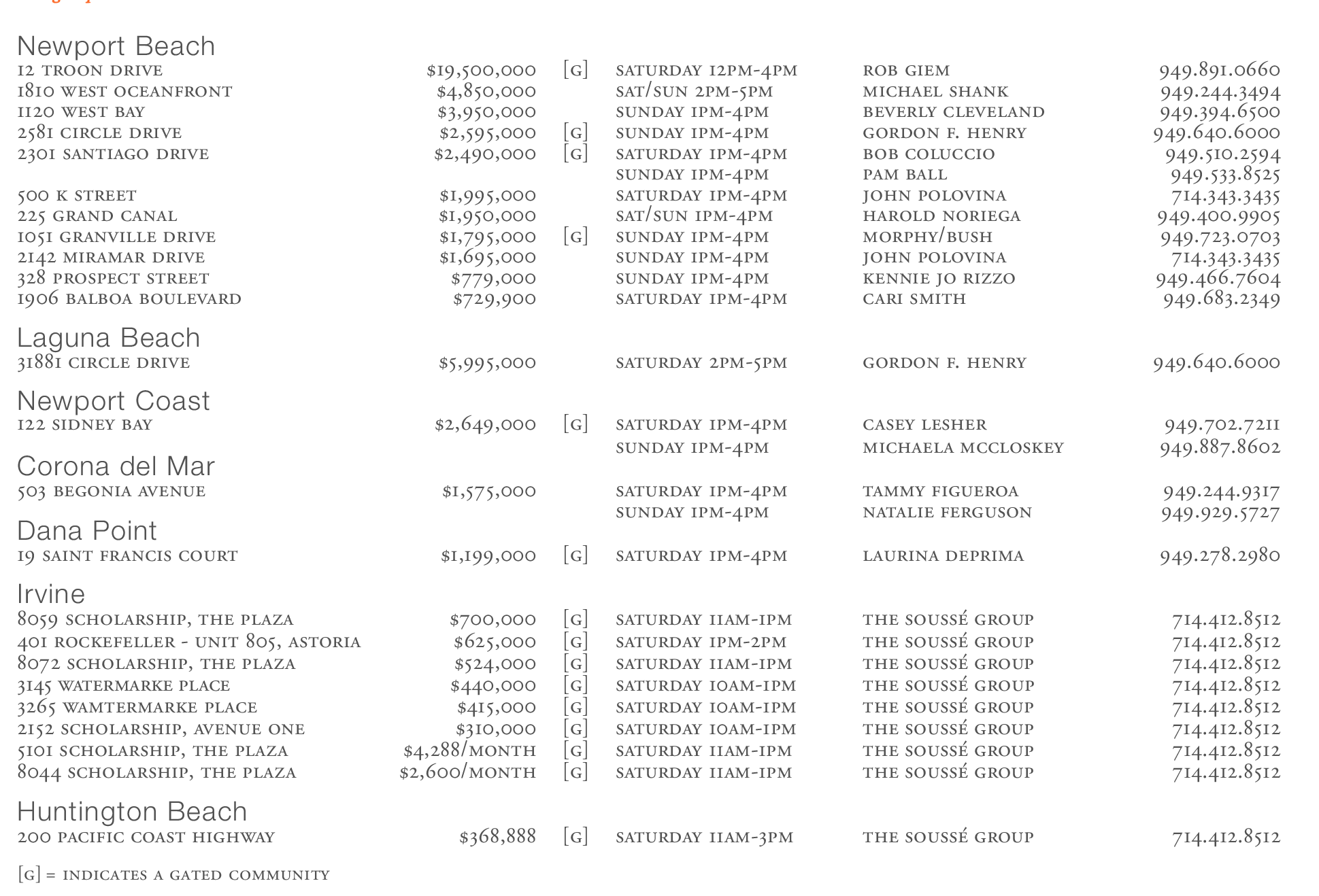 12 troon drive $19,500,000 [g] saturday 12pm-4pm rob giem 949.891.0660 1810 west oceanfront $4,850,000 sat/sun 2pm-5pm michael shank 949.244.3494 1120 west bay $3,950,000 sunday 1pm-4pm beverly cleveland 949.394.6500 2581 circle drive $2,595,000 [g] sunday 1pm-4pm gordon f. henry 949.640.6000 2301 santiago drive $2,490,000 [g] saturday 1pm-4pm bob coluccio 949.510.2594 sunday 1pm-4pm pam ball 949.533.8525 500 k street $1,995,000 saturday 1pm-4pm john polovina 714.343.3435 225 grand canal $1,950,000 sat/sun 1pm-4pm harold noriega 949.400.9905 1051 granville drive $1,795,000 [g] sunday 1pm-4pm morphy/bush 949.723.0703 2142 miramar drive $1,695,000 sunday 1pm-4pm john polovina 714.343.3435 328 prospect street $779,000 sunday 1pm-4pm kennie jo rizzo 949.466.7604 1906 balboa boulevard $729,900 saturday 1pm-4pm cari smith 949.683.2349
