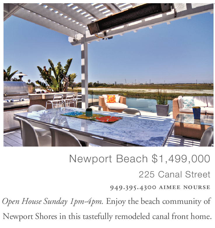 Newport Beach $1,499,000 225 Canal Street 949.395.4300 aimee nourse Open House Sunday 1pm-4pm. Enjoy the beach community of Newport Shores in this tastefully remodeled canal front home.