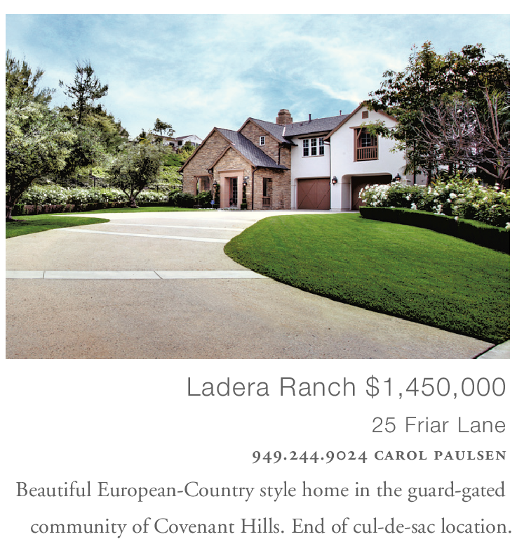 Ladera Ranch $1,450,000 25 Friar Lane 949.244.9024 carol paulsen Beautiful European-Country style home in the guard-gated community of Covenant Hills. End of cul-de-sac location.