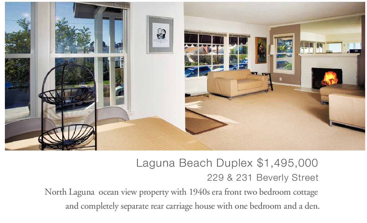 Laguna Beach Duplex $1,495,000 229 & 231 Beverly Street North Laguna ocean view property with 1940s era front two bedroom cottage and completely separate rear carriage house with one bedroom and a den.