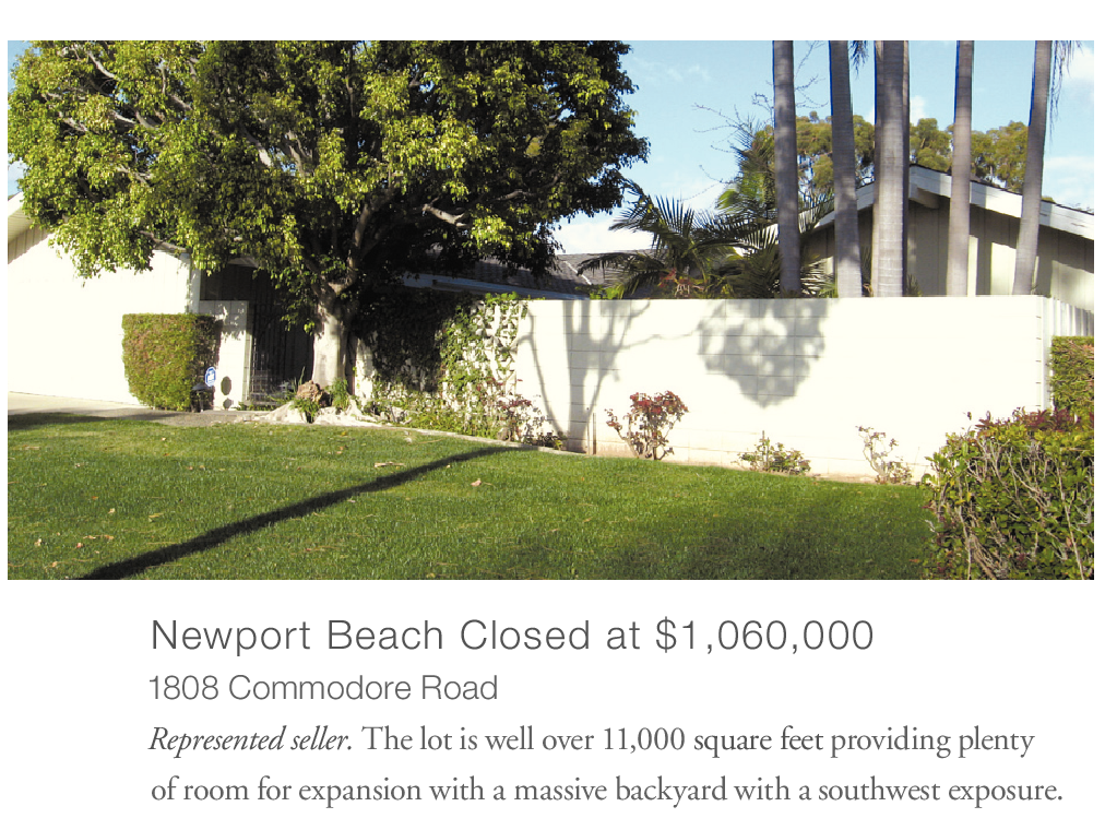 Newport Beach Closed at $1,060,000 1808 Commodore Road Represented seller. The lot is well over 11,000 square feet providing plenty of room for expansion with a massive backyard with a southwest exposure.