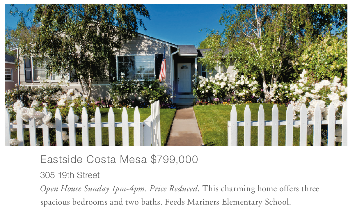 Eastside Costa Mesa $799,000 305 19th Street Open House Sunday 1pm-4pm. Price Reduced. This charming home offers three spacious bedrooms and two baths. Feeds Mariners Elementary School.