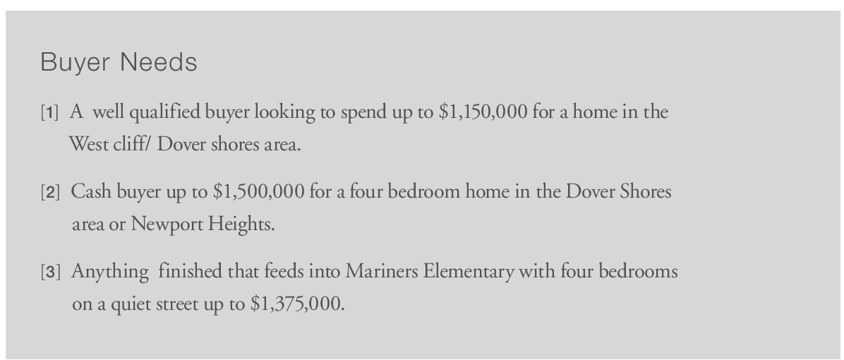 Buyer Needs [1] A well qualified buyer looking to spend up to $1,150,000 for a home in the West cliff/ Dover shores area. [2] Cash buyer up to $1,500,000 for a four bedroom home in the Dover Shores area or Newport Heights. [3] Anything finished that feeds into Mariners Elementary with four bedrooms on a quiet street up to $1,375,000.