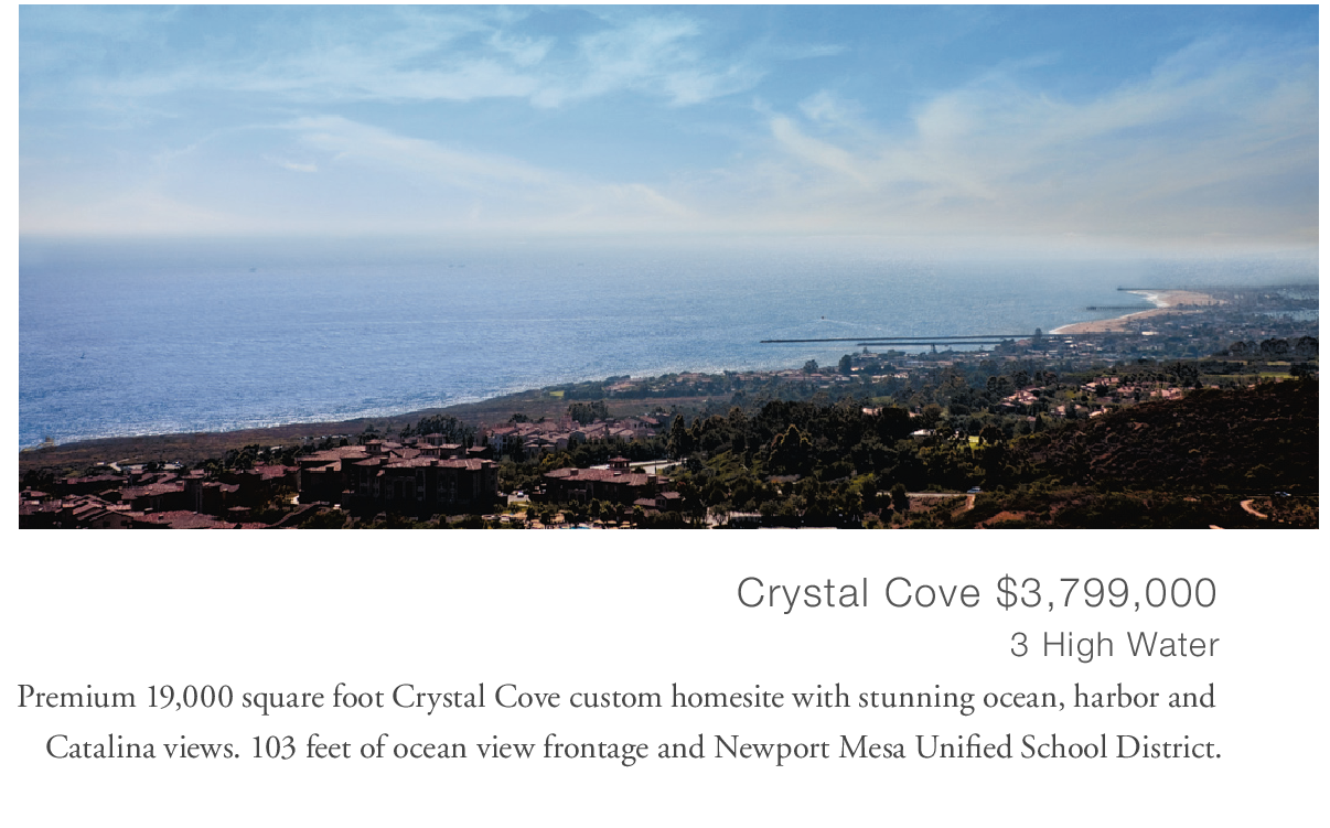 Crystal Cove $3,799,000 3 High Water Premium 19,000 square foot Crystal Cove custom homesite with stunning ocean, harbor and Catalina views. 103 feet of ocean view frontage and Newport Mesa Unified School District.