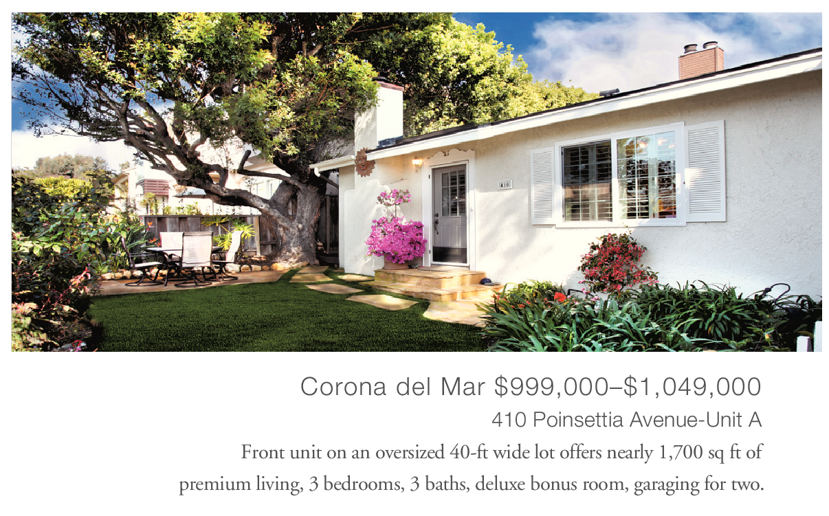 Corona del Mar $999,000–$1,049,000 410 Poinsettia Avenue-Unit A Front unit on an oversized 40-ft wide lot offers nearly 1,700 sq ft of premium living, 3 bedrooms, 3 baths, deluxe bonus room, garaging for two.