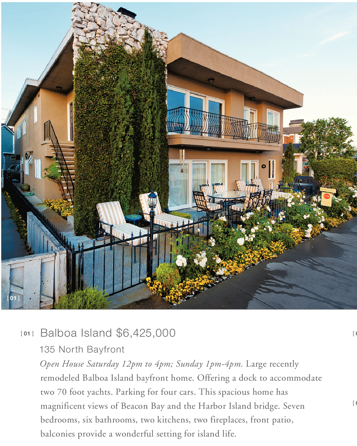 [ 01 ] [ 01 ] Balboa Island $6,425,000 135 North Bayfront Open House Saturday 12pm to 4pm; Sunday 1pm-4pm. Large recently remodeled Balboa Island bayfront home. Offering a dock to accommodate two 70 foot yachts. Parking for four cars. This spacious home has magnificent views of Beacon Bay and the Harbor Island bridge. Seven bedrooms, six bathrooms, two kitchens, two fireplaces, front patio, balconies provide a wonderful setting for island life. [ 02 [ 03