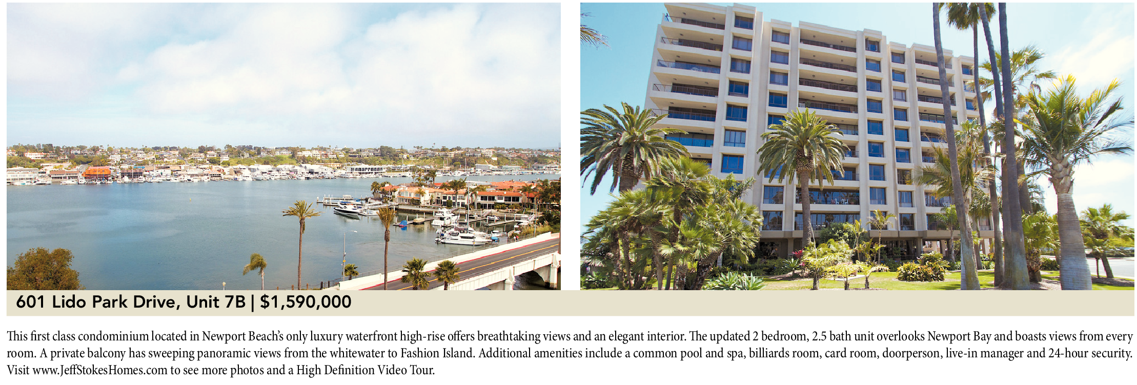 601 Lido Park Drive, Unit 7B | $1,590,000 This first class condominium located in Newport Beach’s only luxury waterfront high-rise offers breathtaking views and an elegant interior. The updated 2 bedroom, 2.5 bath unit overlooks Newport Bay and boasts views from every room. A private balcony has sweeping panoramic views from the whitewater to Fashion Island. Additional amenities include a common pool and spa, billiards room, card room, doorperson, live-in manager and 24-hour security. Visit www.JeffStokesHomes.com to see more photos and a High Definition Video Tour.