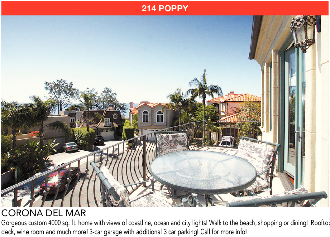 CORONA DEL MAR Gorgeous custom 4000 sq. ft. home with views of coastline, ocean and city lights! Walk to the beach, shopping or dining! Rooftop deck, wine room and much more! 3-car garage with additional 3 car parking! Call for more info!