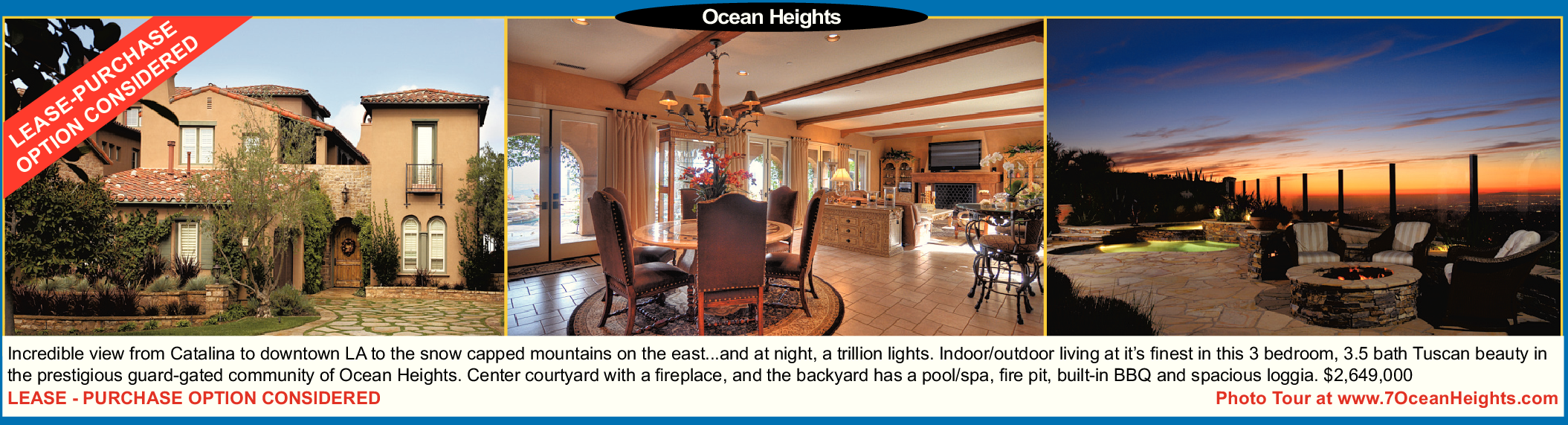 Incredible view from Catalina to downtown LA to the snow capped mountains on the east...and at night, a trillion lights. Indoor/outdoor living at it’s finest in this 3 bedroom, 3.5 bath Tuscan beauty in the prestigious guard-gated community of Ocean Heights. Center courtyard with a fireplace, and the backyard has a pool/spa, fire pit, built-in BBQ and spacious loggia. $2,649,000 LEASE - PURCHASE OPTION CONSIDERED Photo Tour at www.7OceanHeights.com Ocean Heights