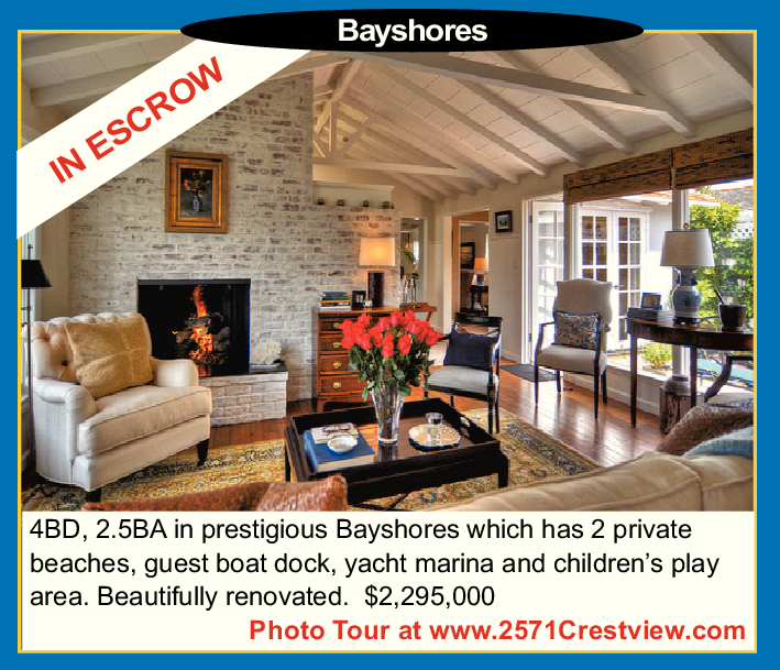 4BD, 2.5BA in prestigious Bayshores which has 2 private beaches, guest boat dock, yacht marina and children’s play area. Beautifully renovated. $2,295,000 Photo Tour at www.2571Crestview.com
