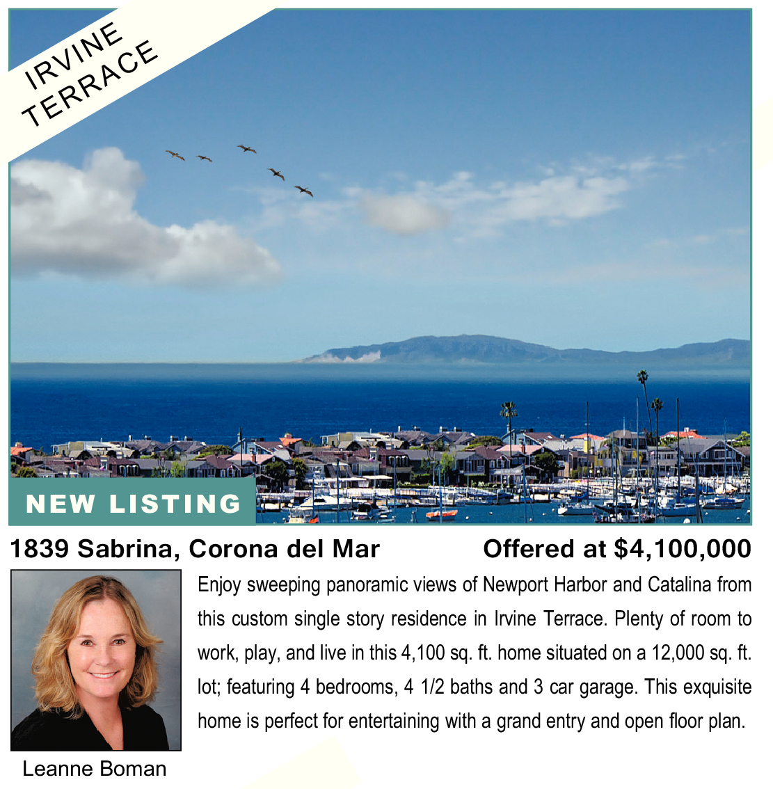 Enjoy sweeping panoramic views of Newport Harbor and Catalina from this custom single story residence in Irvine Terrace. Plenty of room to work, play, and live in this 4,100 sq. ft. home situated on a 12,000 sq. ft. lot; featuring 4 bedrooms, 4 1/2 baths and 3 car garage. This exquisite home is perfect for entertaining with a grand entry and open floor plan. NEW LISTING 1839 Sabrina, Corona del Mar Offered at $4,100,000 Leanne Boman See also