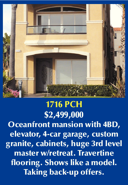 1716 PCH $2,499,000 Oceanfront mansion with 4BD, elevator, 4-car garage, custom granite, cabinets, huge 3rd level master w/retreat. Travertine flooring. Shows like a model.