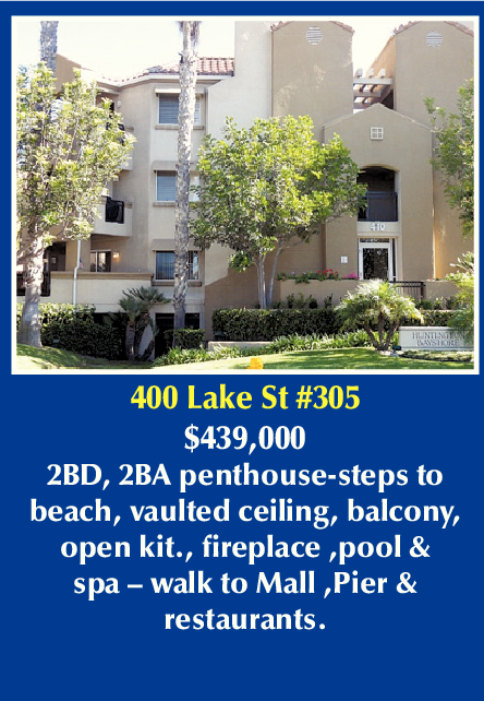 400 Lake St #305 $439,000 2BD, 2BA penthouse-steps to beach, vaulted ceiling, balcony, open kit., fireplace ,pool & spa – walk to Mall ,Pier & restaurants.