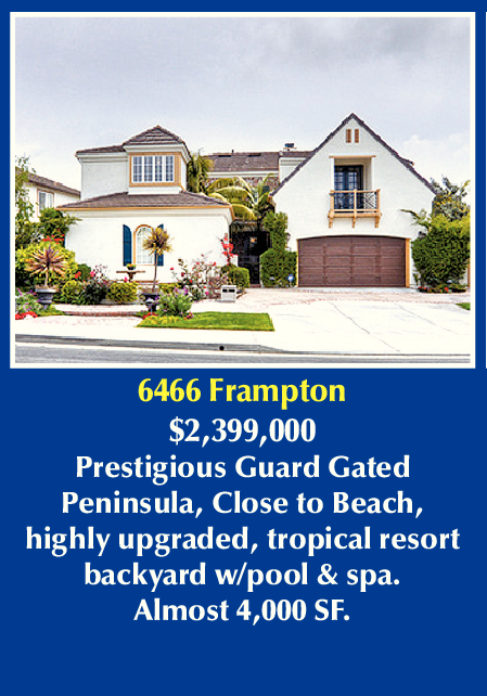 6466 Frampton $2,399,000 Prestigious Guard Gated Peninsula, Close to Beach, highly upgraded, tropical resort backyard w/pool & spa.