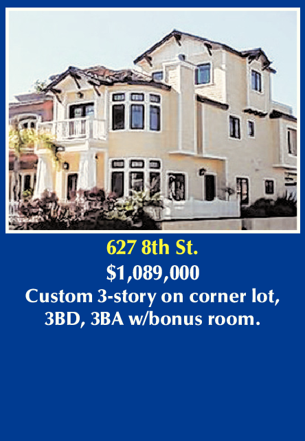 627 8th St. $1,089,000 Custom 3-story on corner lot, 3BD, 3BA w/bonus room.