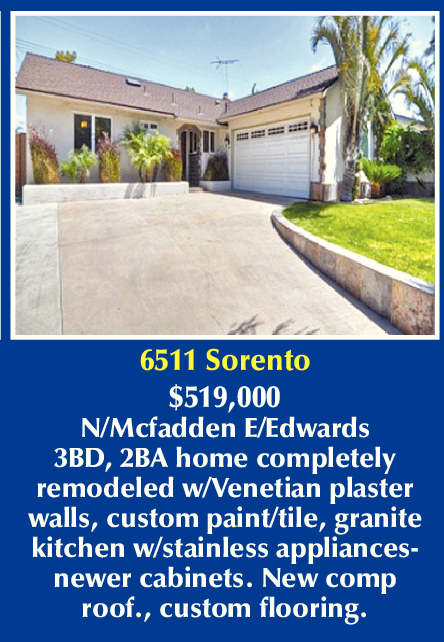 6511 Sorento $519,000 N/Mcfadden E/Edwards 3BD, 2BA home completely remodeled w/Venetian plaster walls, custom paint/tile, granite kitchen w/stainless appliancesnewer cabinets. New comp roof., custom flooring.