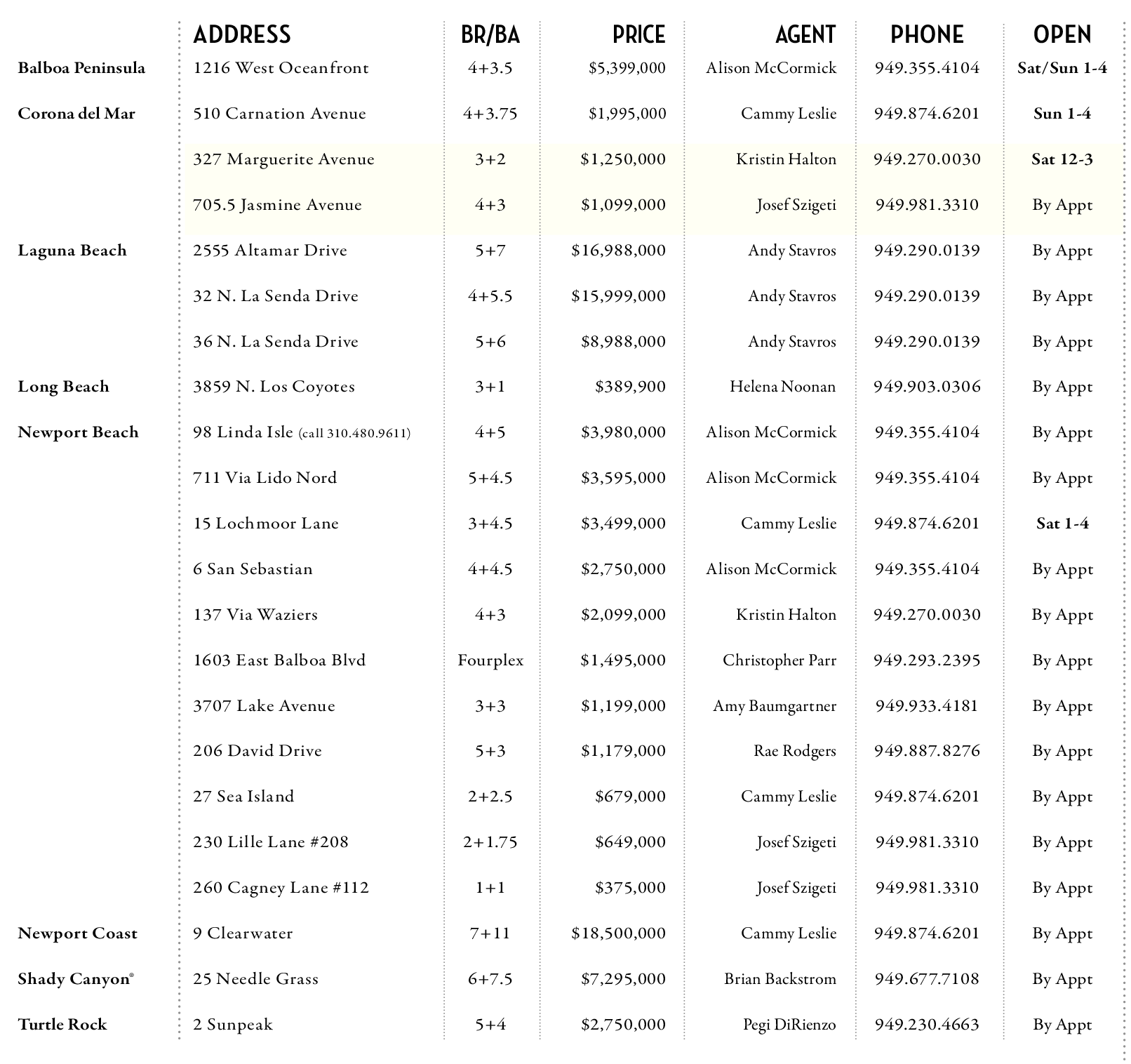 Balboa Peninsula 1216 West Oceanfront 4+3.5 $5,399,000 Alison McCormick 949.355.4104 Sat/Sun 1-4