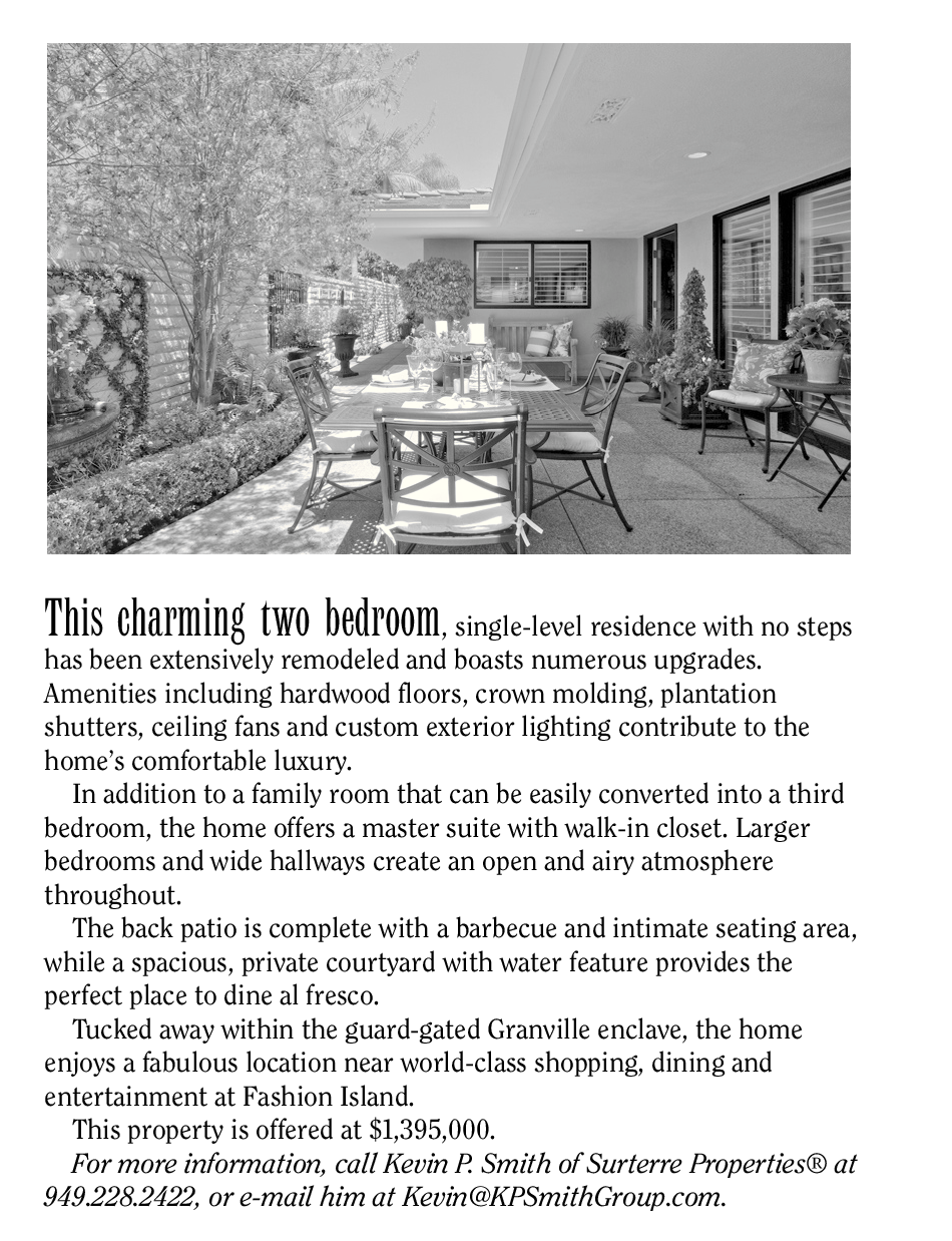 This charming two bedroom, single-level residence with no steps has been extensively remodeled and boasts numerous upgrades. Amenities including hardwood floors, crown molding, plantation shutters, ceiling fans and custom exterior lighting contribute to the home’s comfortable luxury. In addition to a family room that can be easily converted into a third bedroom, the home offers a master suite with walk-in closet. Larger bedrooms and wide hallways create an open and airy atmosphere throughout. The back patio is complete with a barbecue and intimate seating area, while a spacious, private courtyard with water feature provides the perfect place to dine al fresco. Tucked away within the guard-gated Granville enclave, the home enjoys a fabulous location near world-class shopping, dining and entertainment at Fashion Island. This property is offered at $1,395,000. For more information, call Kevin P. Smith of Surterre Properties® at 949.228.2422, or e-mail him at Kevin@KPSmithGroup.com.