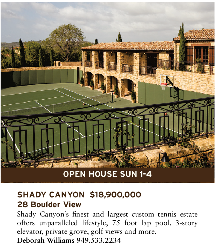 OPEN HOUSE SUN 1-4 SHADY CANYON $18,900,000 28 Boulder View Shady Canyon’s finest and largest custom tennis estate offers unparalleled lifestyle, 75 foot lap pool, 3-story elevator, private grove, golf views and more. Deborah Williams 949.533.2234 See also