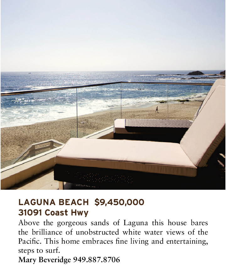 LAGUNA BEACH $9,450,000 31091 Coast Hwy Above the gorgeous sands of Laguna this house bares the brilliance of unobstructed white water views of the Pacific. This home embraces fine living and entertaining, steps to surf. Mary Beveridge 949.887.8706