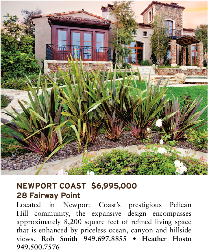 NEWPORT COAST $6,995,000 28 Fairway Point Located in Newport Coast’s prestigious Pelican Hill community, the expansive design encompasses approximately 8,200 square feet of refined living space that is enhanced by priceless ocean, canyon and hillside views. Rob Smith 949.697.8855 • Heather Hosto 949.500.7576