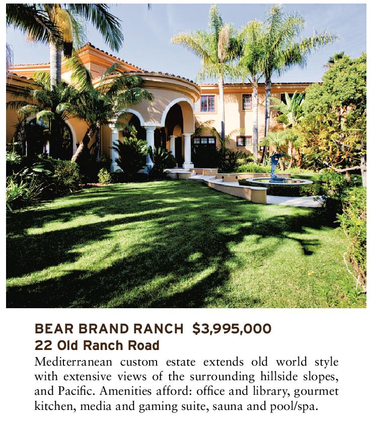 BEAR BRAND RANCH $3,995,000 22 Old Ranch Road Mediterranean custom estate extends old world style with extensive views of the surrounding hillside slopes, and Pacific. Amenities afford: office and library, gourmet kitchen, media and gaming suite, sauna and pool/spa.